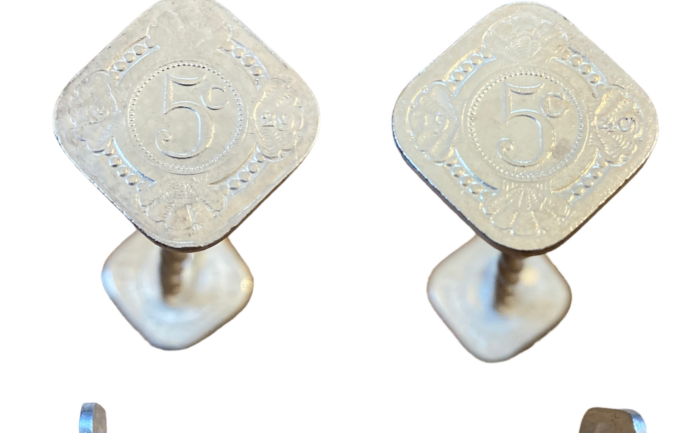 Een messenlegger met twee vierkante Wilhelmina stuivers uit de jaren 1929 en 1940 dat gemaakt werd als teken van stil verzet tegen de Duitse bezetter tijdens de Tweede Wereldoorlog. De stuivers zijn overigens niet van zilver, maar gemaakt van nikkel. Dergelijke stil verzet messenleggers werden…